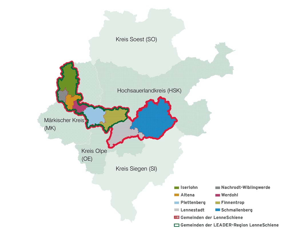 Bereits vor zehn Jahren begannen die Städte und Gemeinden Schmallenberg, Lennestadt, Finnentrop, Plettenberg, Altena, Werdohl, Nachrodt-Wiblingwerde und Iserlohn durch eine intensive interkommunale Zusammenarbeit ihre kommunale und regionale Entwicklung gemeinsam zu lenken. Zusammen bilden sie die LenneSchiene, gesteuert durch einen informellen Arbeitskreis der Planungsämter für einen Gesamtraum von fast 900 km2, 230.000 Einwohnern und über 100 Flusskilometern der Lenne. Die langjährige Zusammenarbeit hat sich bewährt und für die Region die Marke „LenneSchiene“ etabliert.